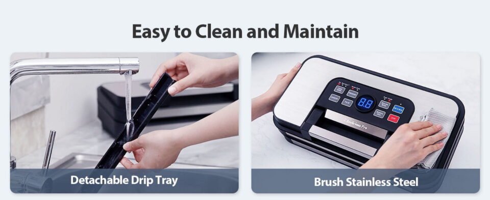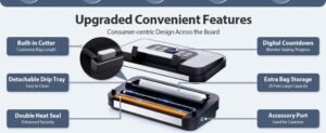 Features: Double heat sealing, bag storage, cutter, countdown display, removable drip tray