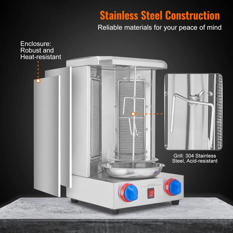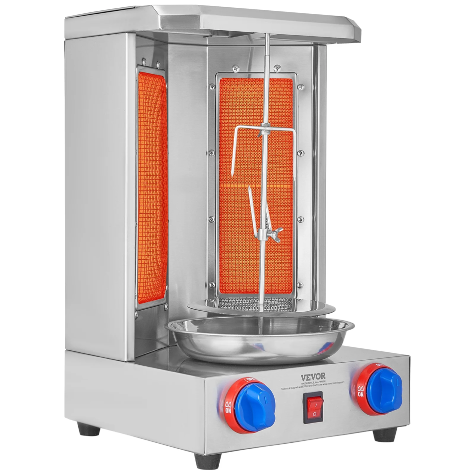 Bring restaurant-quality grilling to your kitchen or business with this high-performance gas shawarma machine. Built with durable stainless steel, dual heating tubes, and a 360° rotational motor, it delivers even, flavorful cooking every time. Perfect for home chefs, catering, food trucks, and commercial kitchens.